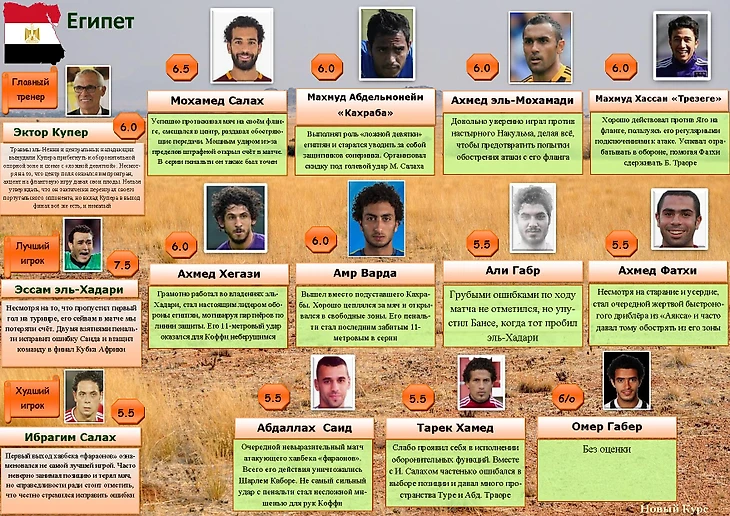 Несомненно, для Эктора Купера выход в финал на первом же своём Кубке Африки (тем более, со сборной, несколько лет не выходившей на турнир «чёрного» континента) было бы блестящим достижением. Но между ним и идеальной с его точки зрения игрой египтян предательски вставала стена лазарета. Оба центрфорварда «фараонов», Марван Мохсен и Ахмед Хассан, остались вне заявочного листа. Не восстановился от повреждения и Мохаммед эль-Ненни. Это внесло серьёзные коррективы в планы аргентинского наставника, и он снова вынужден был отдать сопернику центр поля и сделать акцент на фланговую игру. Ахмед Фатхи, неважно проявивший в себя в качестве опорника, отправился на левый фланг обороны. В пару к Тареку Хамеду играть свой первый матч на турнире прибыл Ибрагим Салах. В не совсем понятной для себя роли «ложной девятки» должен был сыграть Махмуд Кахраба.