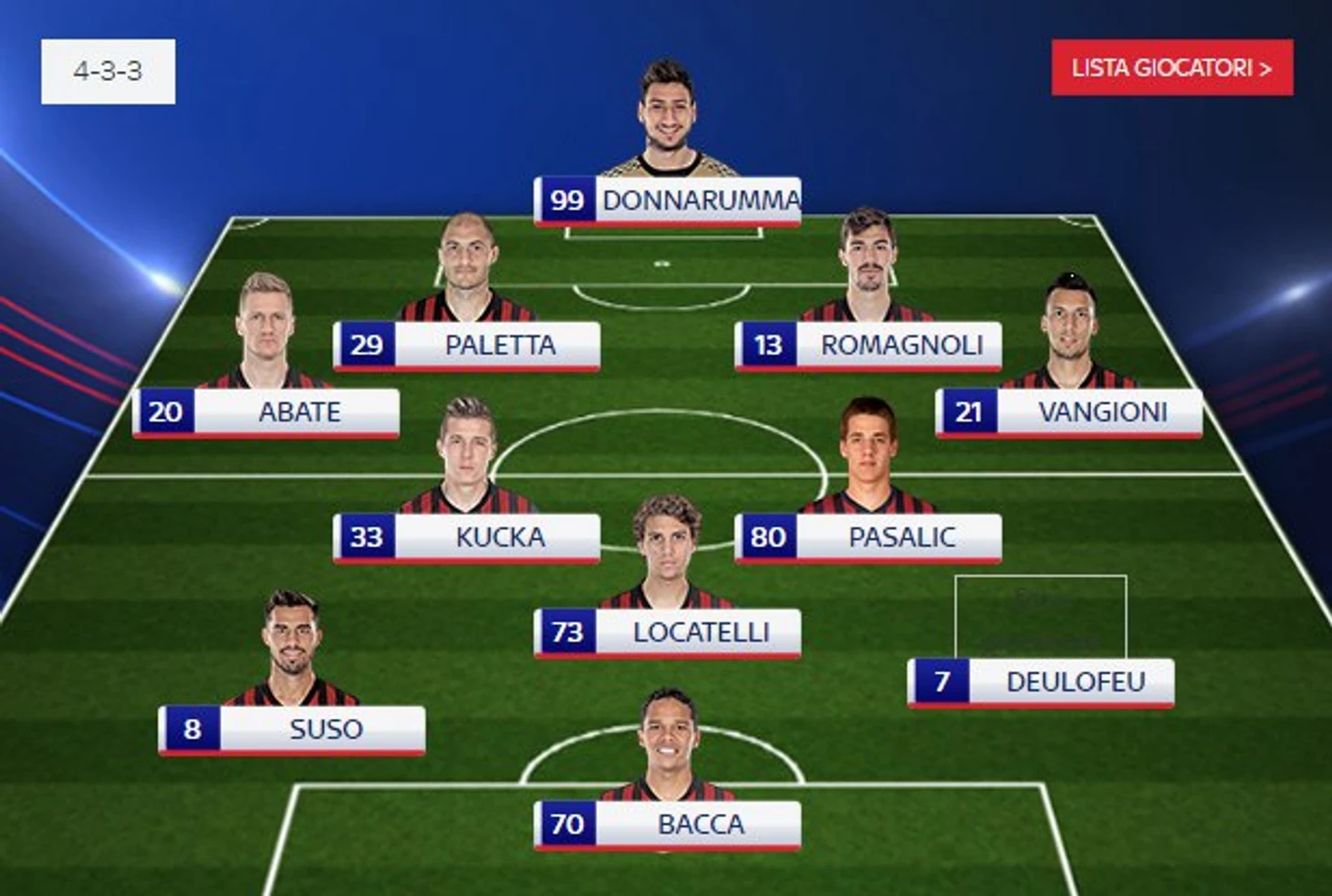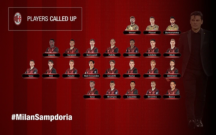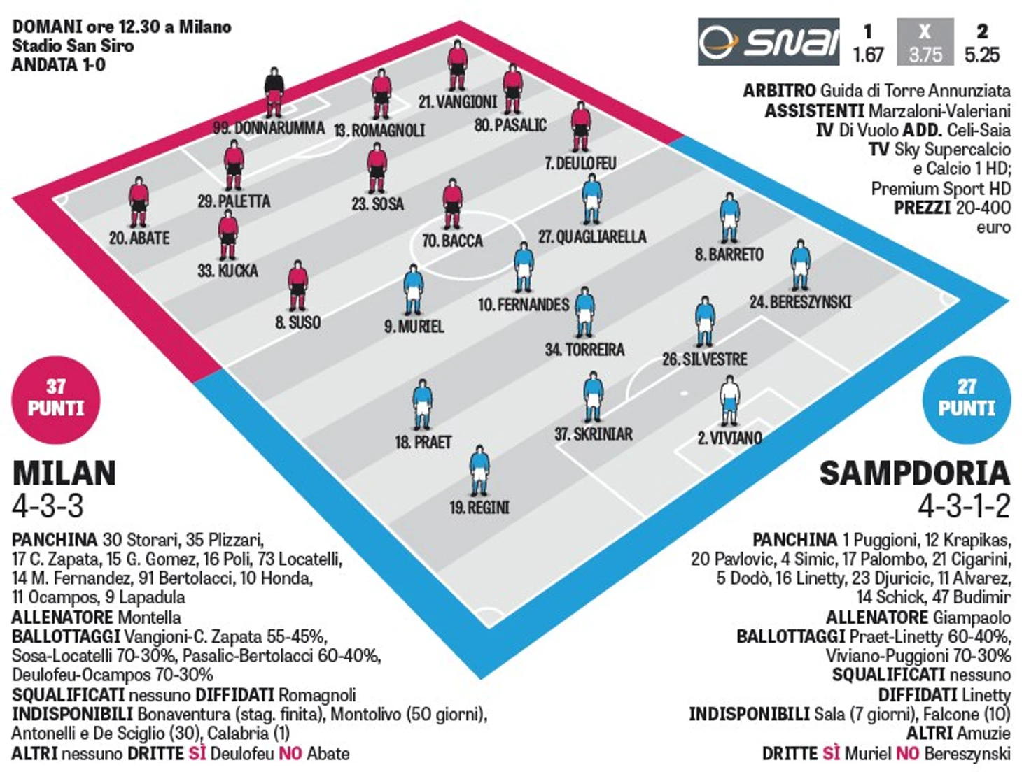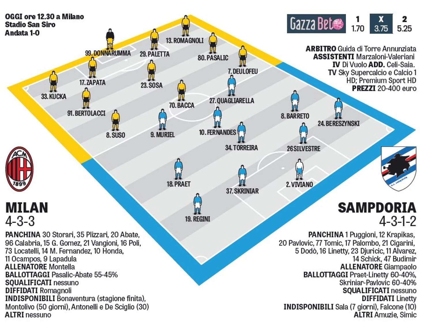 Что касается стартового состава «Милана» на матч против «Сампдории». Изначально планировалось, что кардинальных изменений в числе стартовых одиннадцати у «Милана» не будет и Монтелла сделает чисто позиционных замены. Так вместо Де Шильо вышел бы единственный здоровый левый защитник команды Леонель Ванджони, а что касается травмы Бонавентуры, то планировалось, что место на левом фланге атаки займет Деулофеу, а слева в центре полузащиты сыграет кто-либо из пары Пашалич/Бертолаччи.