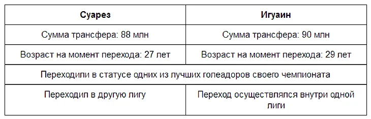 У многих (у меня - в том числе) может возникнуть в голове невольное сравнение трансферов Игуаина в “Ювентус” и Луиса Суареза - в “Барселону”. Коротко об этом: