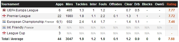 Apps - матчи; Mins - минут сыграно; Tackles - отборов за игру; Inter - перехватов за игру; Fouls - фолов за игру; Offsides - оффсайды; Clear - выносов за игру; Drb - успешных обводок за игру; Blocks - заблокировано ударов за игру; OwnG - автоголы; Rating - средний рейтинг.
