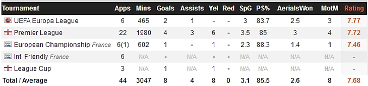 Apps - матчи; Mins - минут сыграно; Goals - голы; Assists - передачи; Yel - желтые карточки; Red - красные карточки; SpG - ударов за игру; PS% - процент точных пасов; AerialsWon - выиграно воздушных дуэлей; MotM - награда “игрок матча”; Rating - рейтинг.