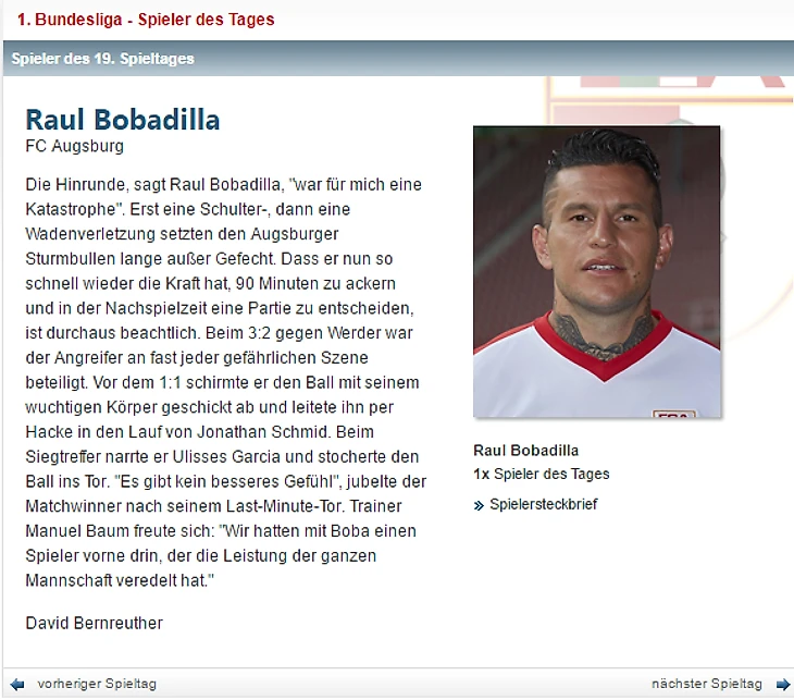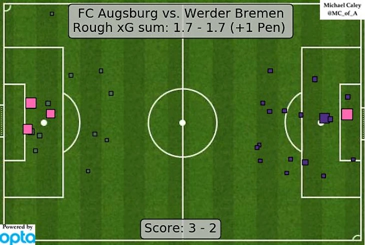 Во втором тайме Макс Крузе забил с пенальти за фол против Гнабри, но хозяева вновь отыгрались усилиями Ку Чжа Кхоля. Развязка наступила 90+4 минуте. Герой матча Бобадилья занес в сетку ворот «Вердера» победный матч. «Аугсбург» забирается в серединку турнирной таблицы, оставляя «Вердер» оглядываться на зону вылета.