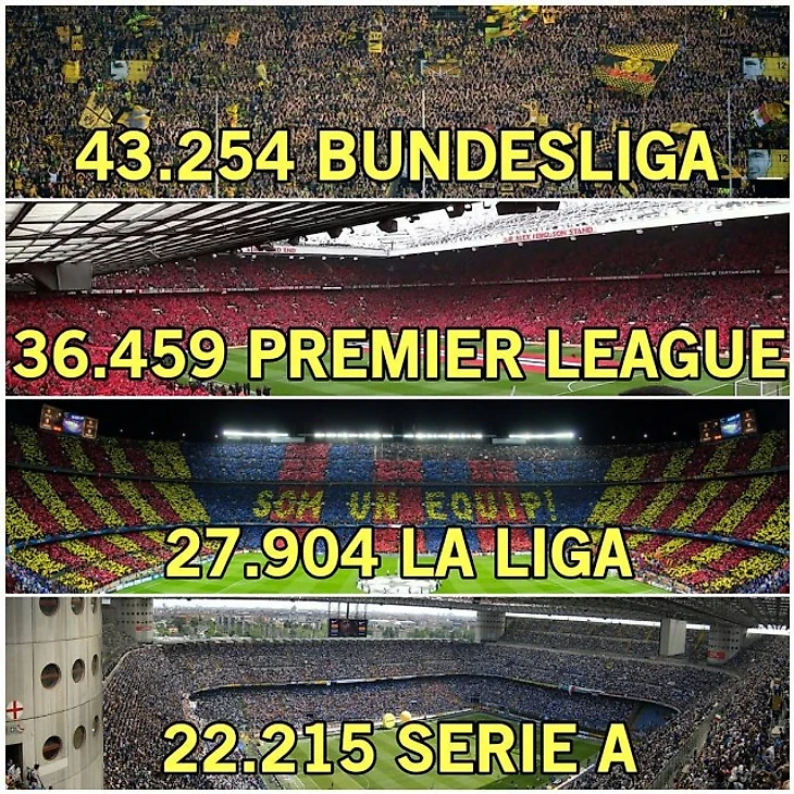 Итоговая средняя посещаемость по результатам обработки всех проданных билетов за прошлый (2015/2016) сезон в Европе. У Бундеслиги прекрасный результат.