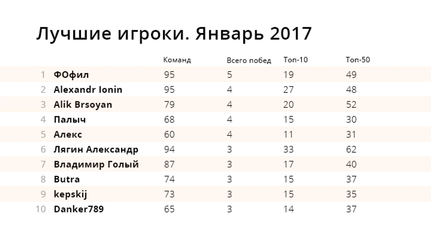 По традиции, представляем вам 10 топовых игроков проекта прошедшего месяца: