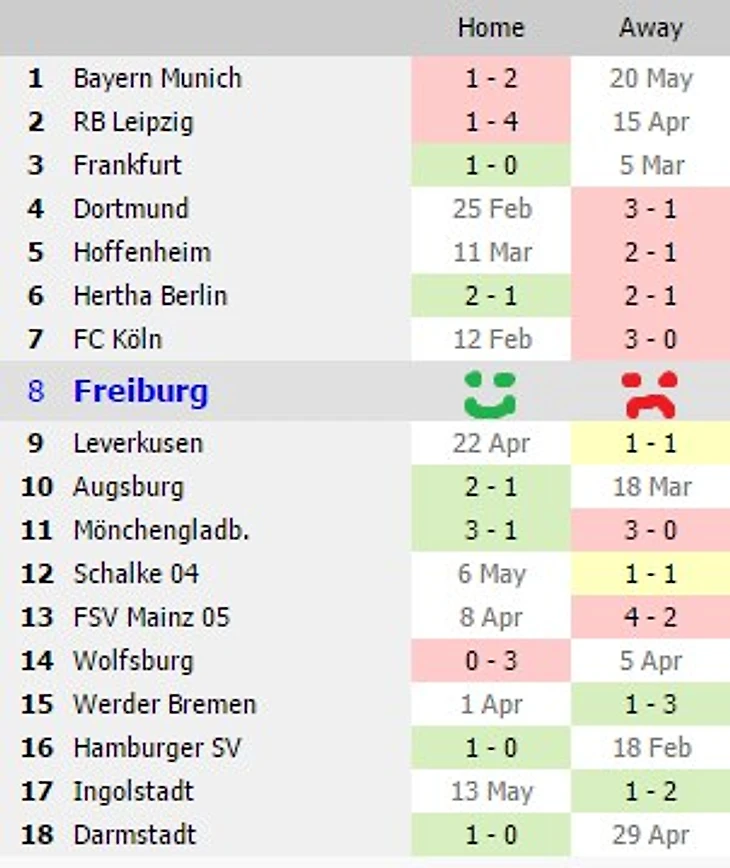 В гостях Фрайбург добыл лишь 2 победы – над Вердером (15 место; 1:3) и Ингольштадтом (17 место; 1:2). Также были 2 ничьи 1:1 с Шальке и Байером. Остальные 6 встреч проиграны – с минимум 2 пропущенными мячами. Фрайбург не смог оставить ворота сухими во всех 10 выездах.