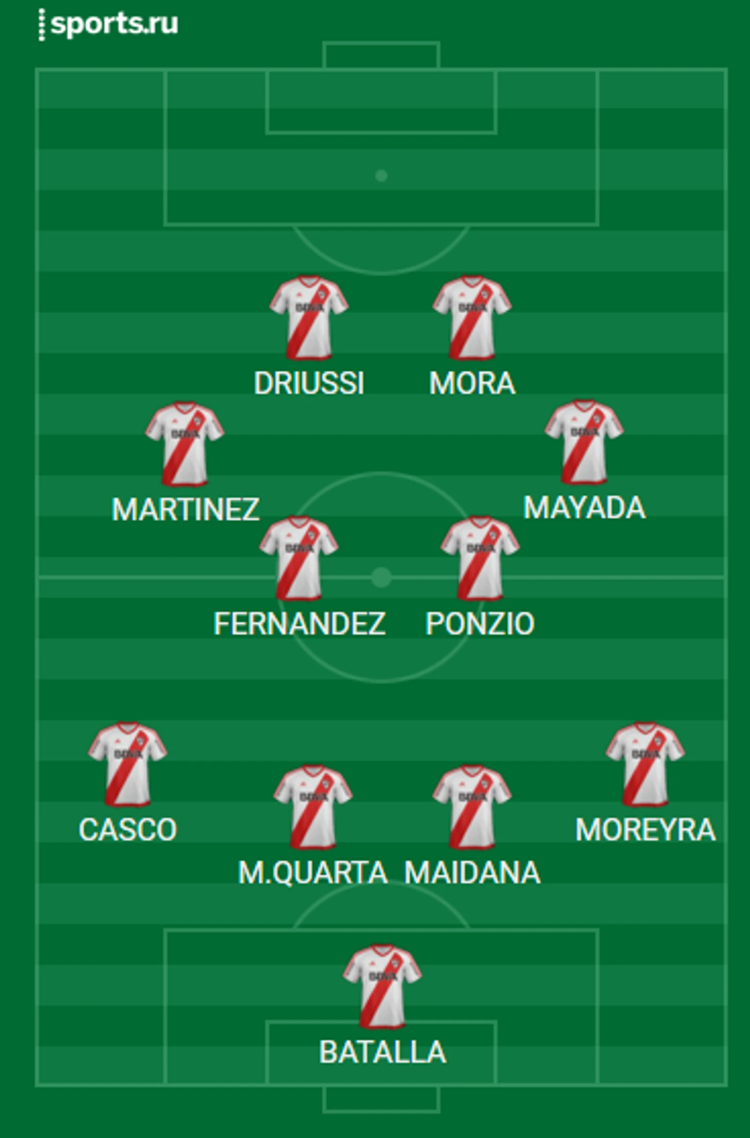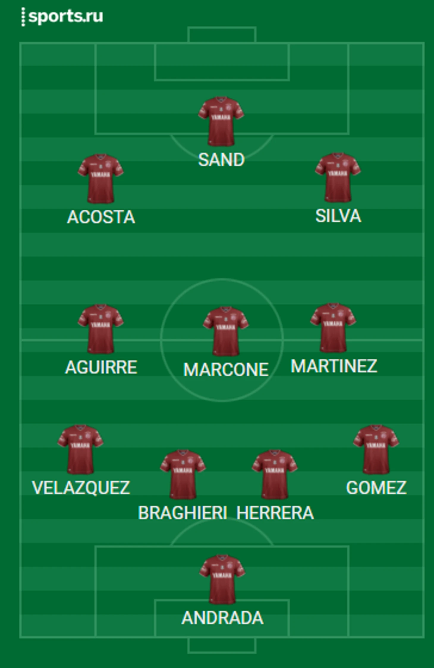Посмотрим на расстановку сил на футбольном поле, Итак, Альмирон выставил оптимально сильнейший состав на сегодняшний день, исключения коснулись только вратарской позиции. По прежнему восстанавливается после травмы основной голкипер Монетти, его место занял Эстебан Андрада. Место уехавшего в США Мигеля Альмирона, занял Николас Агирре. Как по мне, так замена равноценна, просто игроки немного разноплановые. Агирре это игровая мощь и характер, Мигель больше скорость и техника. Состав вполне предсказуем, вопросы могли возникнуть по позиции Роман Мартинес или Баррьентос, не более.