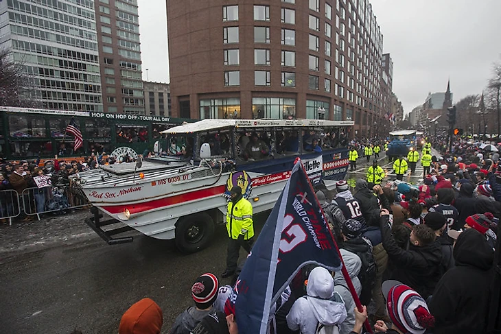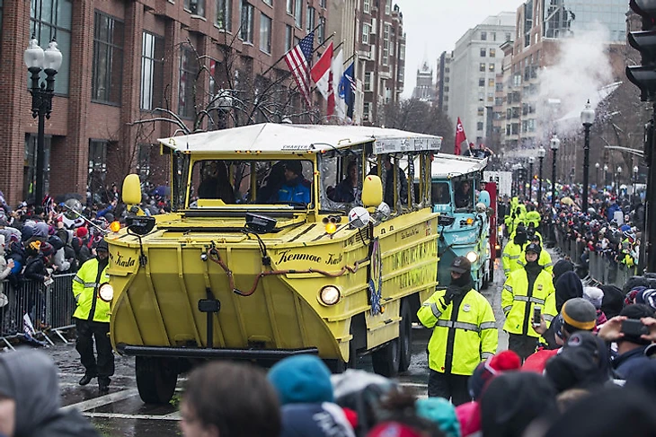 Знаменитые duck boats – машины-амфибии, котрые сначали выпускались для военных, а теперь используется как экскурсионные автобусы.