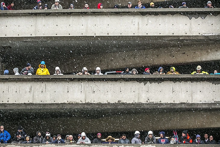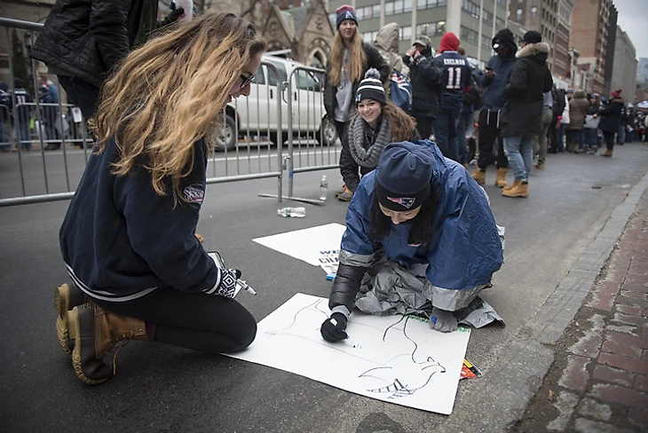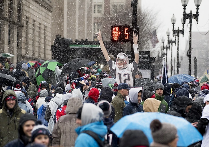 На чемпионов НФЛ пришли посмотреть сотни тысяч (а возможно, и миллион) человек. Как и два года назад, Бостону не повезло с погодой в день парада: снег, дождь, около нуля по Цельсию.
