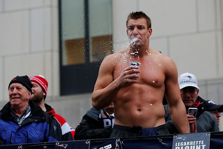 Еще одна звезда «Пэтриотс» Роб Гронковски. Главному весельчаку команды кто-то из толпы заботливо бросил банку пива.