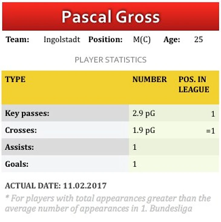 Полузащитник "Ингольштадта" Паскаль Гросс на данный момент является лидером по среднему за матч числу передач под удар (2.9) и разделяет с Йоханессом Гайсом (Шальке 04) первую строчку по числу кроссов (1.9).