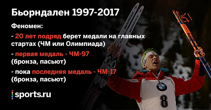 Уникально другое: с 1997 года Бьорндален не уезжает без медалей с чемпионатов мира и Олимпийских игр.