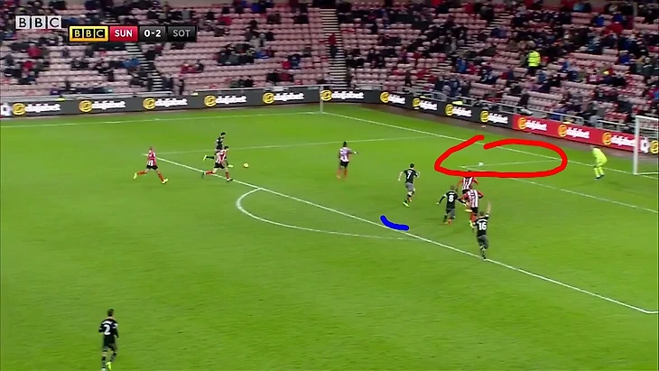 Все тот же Редмонд беспрепятственно принимает мяч. Зачем игроки "Сандерленда" атакуют его вдвоем? Или делают вид, что атакуют. Пусть игрок, который находится дальше от полузащитника "Саутгемптона", бежит страховать полузащитника, который не успевает накрыть Бертрана. Но нет, лучше вдвоем встречать Редмонда. Так тот, видимо, больше напугается!И да, почему крайний хав "котов" не вернулся вовремя? Почему, когда его команда обороняется, он бороздит просторы половины соперника?