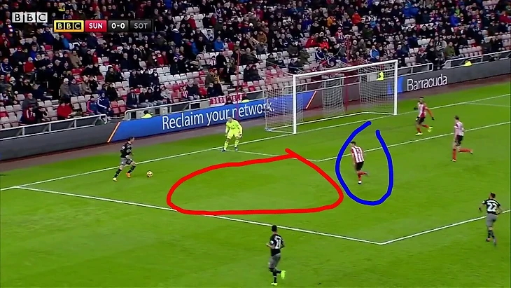 Обратите внимание на расположение двух центральных полузащитников. Которые абсолютно посредственно участвуют в моменте! Они должны лететь на Тадича, а не находится в полупозиции. Конечно, центральные дефы в данном моменте тоже действуют бестолково, запуская за спину Габбьядини, но главное это то, что полузащита дает Тадичу пространство, которого ему хватает, чтобы сделать острый пас. Крайний защитник "Сандерленда" также не очень активно принимает участие в обороне команды. Он должен страховать центр, но никак не стоять и не смотреть на мяч!