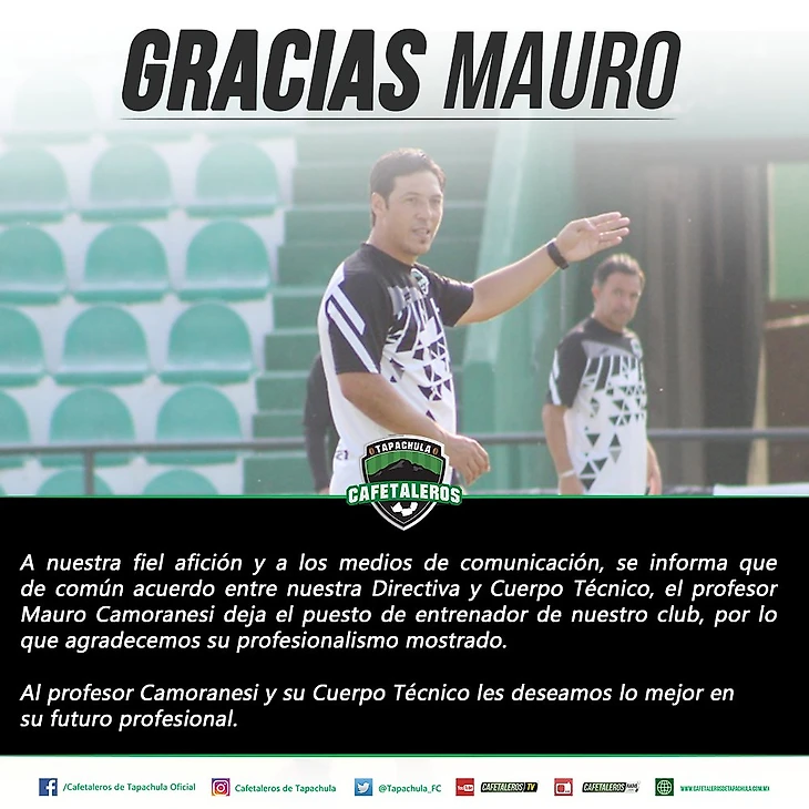 23 января 2017 г. руководство мексиканского футбольного клуба "Cafetaleros de Tapachula" объявило об оставке с поста главного тренера Мауро Каморанези. Чемпион мира 2006 г. в составе сборной Италии, Каморанези начал свою тренерскую карьеру в 2015 г., возглавив скромный мексиканский "Корас де Тепик". Однако, тренерская карьера Каморанези совершенно не задалась. К февралю 2017 г. итальянец аргенинского происхождения, не отработавший ни в одном клубе в качестве тренера ни одного полноценного сезона, снова оказался без работы. Ни в "Корас", ни в аргентинском "Тигре", ни в "Кафеталерос" Каморанези не смог добиться позитивного результата, с трудом набирая очки и выдавая безвыигрышные серии.