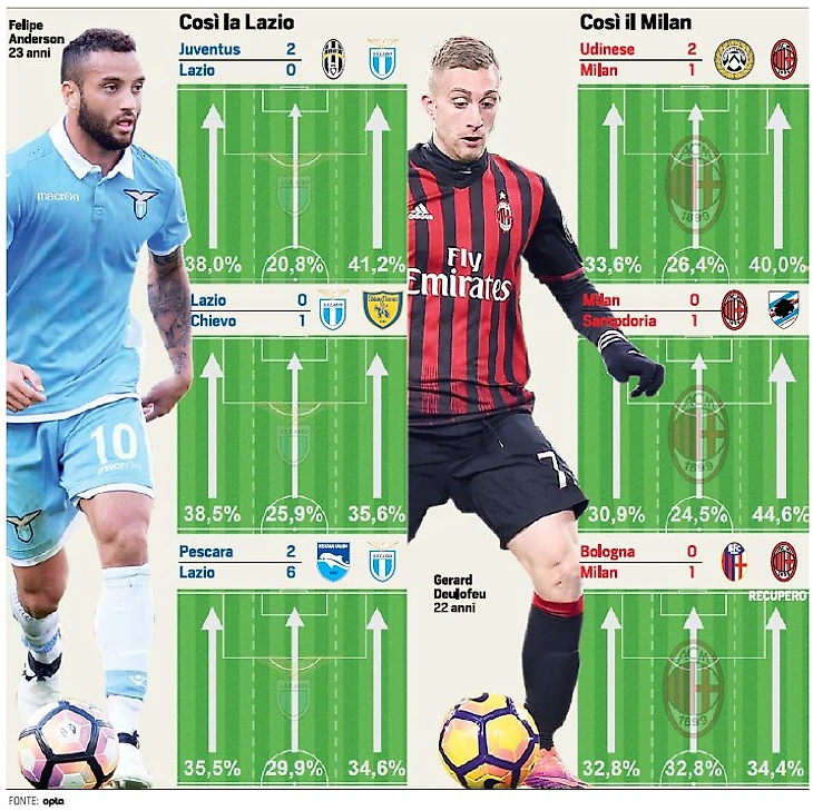 Издание Il Corriere dello Sport предлагает нам взглянуть на распределение атакующих действий «Лацио» и «Милана» в своих последних трех сыгранных матчах.