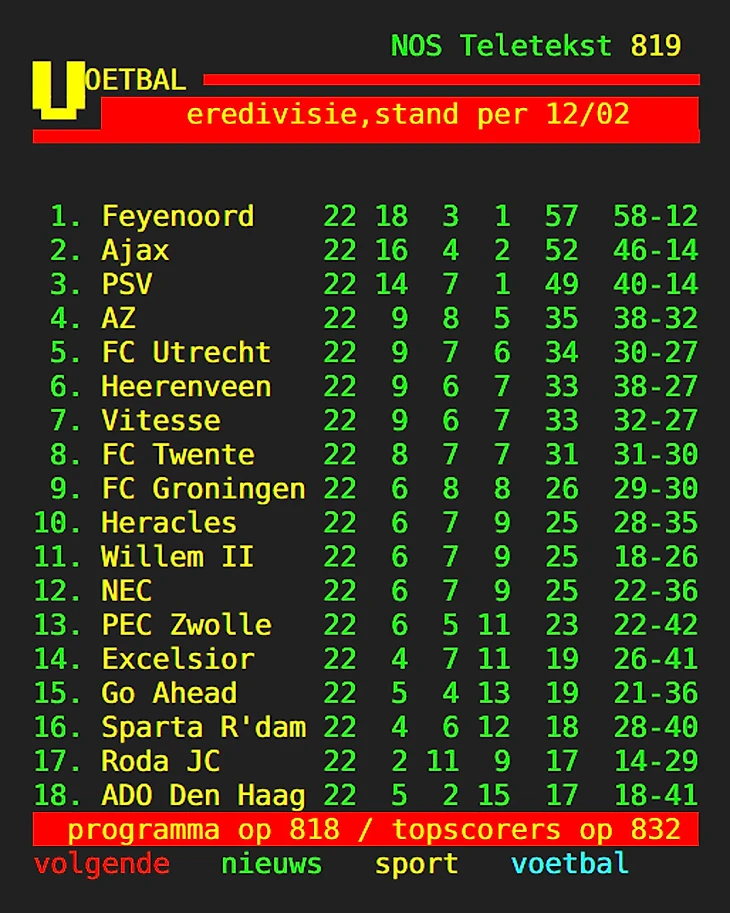 В результате нестабильности АЗ, Херенвена и Утрехта отрыв "большой тройки" от пелотона составляет уже 14 очков (у всей троицы во втором круге 5 из 5). Вероятно, повторится сценарий сезона 2002/2003, когда "большая тройка" преодолела рубеж в 80 пунктов (ПСВ-84, Аякс-83, Фейе-80), а отрыв от четвертой команды (НАК) составил 28 очков.