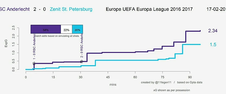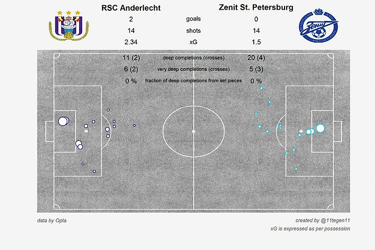 1) Андерлехт переиграл Зенит примерно на 1 гол (0,83 xG), поэтому более закономерными были бы результаты 2-1 или 3-2, что серьёзно повысило бы шансы петербургсой команды в этом противостоянии;