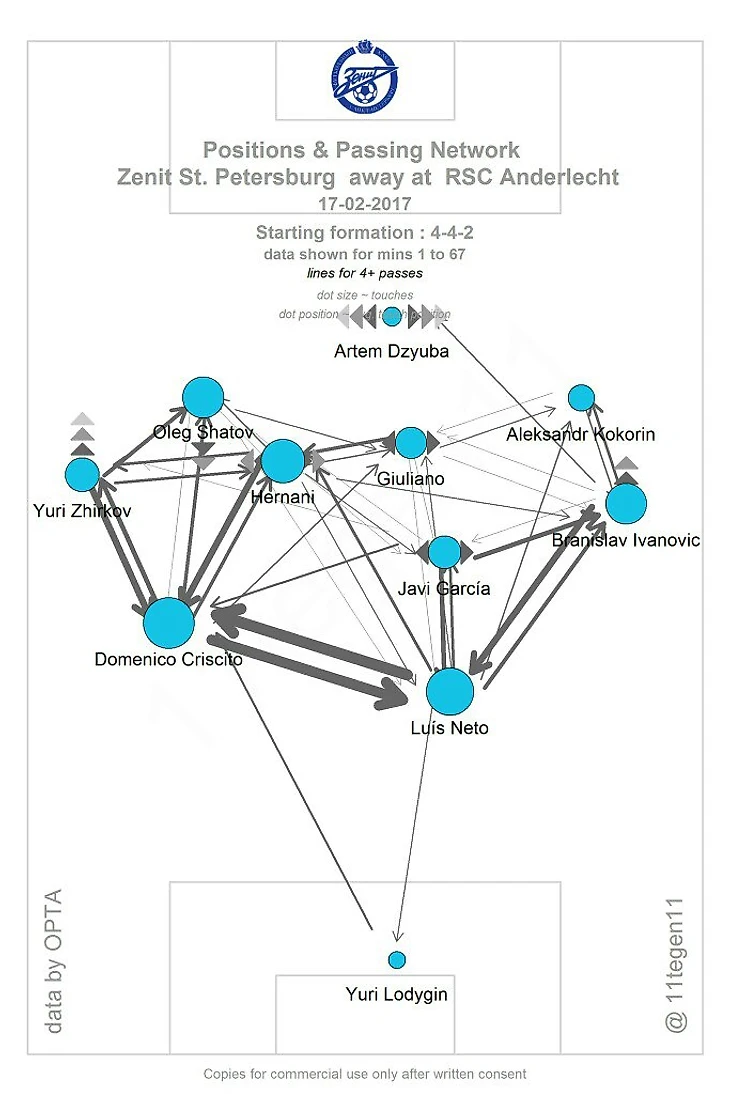 Последний пункт в какой-то мере связан с плохим качеством поля, о котором говорили Луческу и некоторые футболисты. Есть, конечно, люди, которые скажут, что обе команды были в равных условиях, но проблема в том, что Зенит в основном играет в короткий/средний пас, а Андерлехт использовал длинные передачи, что частично прослеживается на первом изображении. Поэтому влияние поля на игру Зенита сильнее, чем на игру бельгийской команды. Примечательно то, что низом Зенит почти ничего не создал, а все моменты у чужих ворот пришли после забросов (в основном от Кришито) и подач (от фланговых защитников). Поэтому фактор поля значительный. И есть надежда на более качественную игру Зенита с мячoм в Санкт-Петербурге.