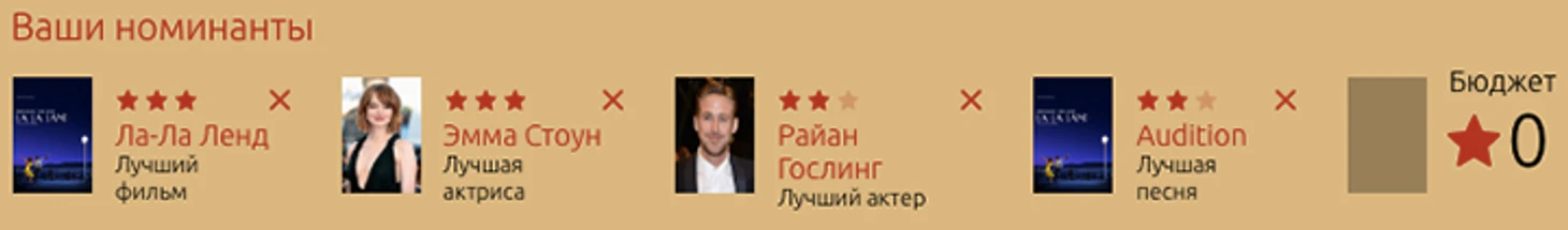 Чтобы не теряться в технических номинациях, можно оставить только самые популярные. Как и в съемочном процессе, самое важное – уложиться в бюджет. И это не так-то просто: блокбастеры прошлого года звезд с неба не хватают, а самих звезд в вашем бюджете всего 10. Этой суммы даже не хватит, чтобы собрать пятерку номинантов только из главного фаворита, «Ла Ла Ленд»: