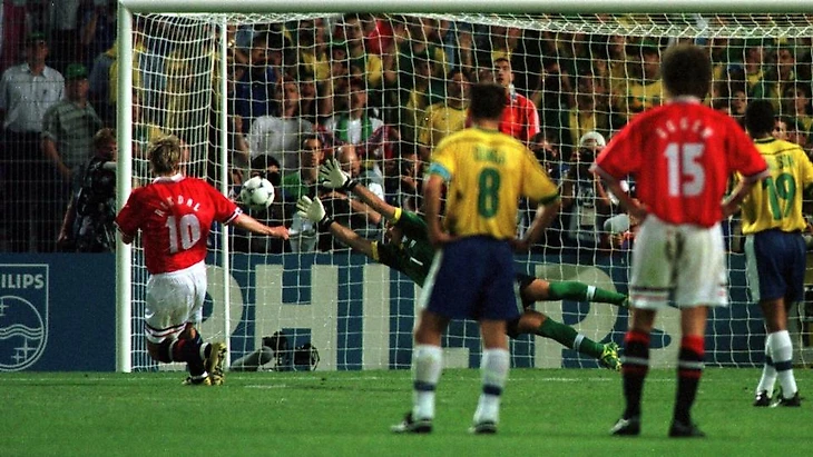 Хьетиль Рекдаль с пенальти устанавливает окончательный счет в матче сборных Бразилии и Норвегии (1:2)