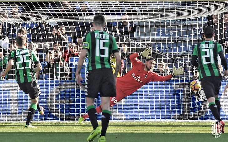 К точке подошел не кто иной, как Доменико Берарди. И, казалось бы, быть началу очередной серии неудачных игр на Мапеи. Но разбег… И Берарди бьёт мимо ворот Доннаруммы. К слову, стоит отметить, что Джиджо, отпраздновавший на днях свое совершеннолетие, направление удара угадал, и будь чуть точнее Доменико, портьере «Милана» имел все шансы собственноручно отразить его удар. А так 0-0. Выдохнули. Едем дальше.