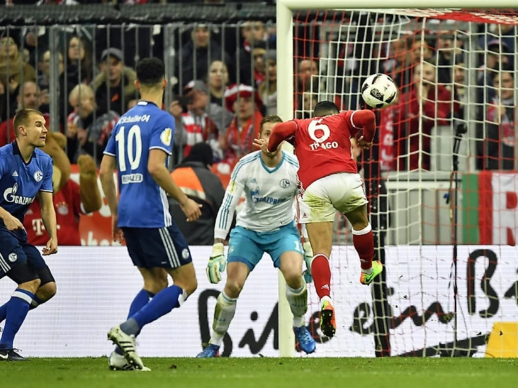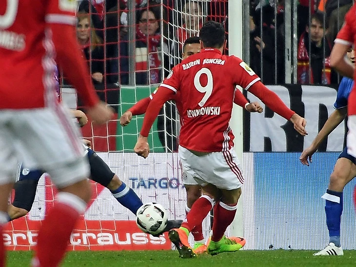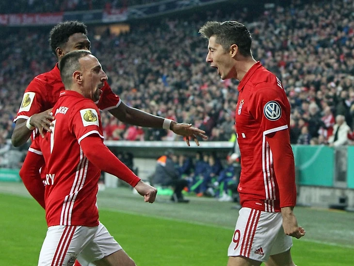 Несколько недель назад "Бавария" и "Шальке" встречались на "Альянц-Арене" в чемпионате. "Шалькеры" тогда выглядели достойно, сведя матч к ничьей. Как и 4 февраля мюнхенцы бодро начали, открыв счет уже на 3-й минуте, Роберт Левандовски воплотил в гол шикарную передачу вернувшегося в состав Франка Рибери. На этот раз баварцы не стали повторять ошибок трехнедельной давности, продолжив давить. Серия опасных атак привела к второму голу в ворота Фэрманна. Левандовски уже выступил в роли ассистента, а завершил атаку ударом головой Тиаго. Но и на этом "Бавария" не успокоилась, на исходе получаса игры Левандовски оформляет дубль, а Рибери записывает на свой счет второй результативный пас. Поляк добрался до отметки в 97 забитых мячей за мюнхенский клуб (ждем юбилейного гола уже в ближайшее время, всего же в активе Роберта теперь 200 голов за немецкие клубы), кроме того, Левандовски забил 30-й мяч в официальных играх текущего сезона. Третий гол окончательно убил интригу в противостоянии. Второй тайм превратился в открытую тренировку в присутствии 75000 зрителей. Из событий второй половины игры стоит выделить разве что удаление Бадштубера. "Бавария" одерживает уверенную победу и в восьмой раз подряд проходит в полуфинал турнира. "Шальке" не добирался до этой стадии с 2011 года, когда "кобальтовые" выиграли трофей.