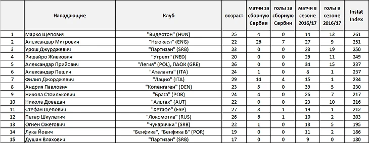 Муслину пора прекращать страдать ерундой со всякими Пешичами, Павловичами и брать в команду действительно лучших. Статистика говорит нам, что на сегодня кроме Митровича это Прийович и Урош Джурджевич (чёрный Живкович пока не доступен, а на показатели Шчепакабры в Венгрии я бы не смотрел всерьёз). Недалеко от истины, но на матч с Грузией я бы остановился на Митровиче, Прийовиче и Стоильковиче.