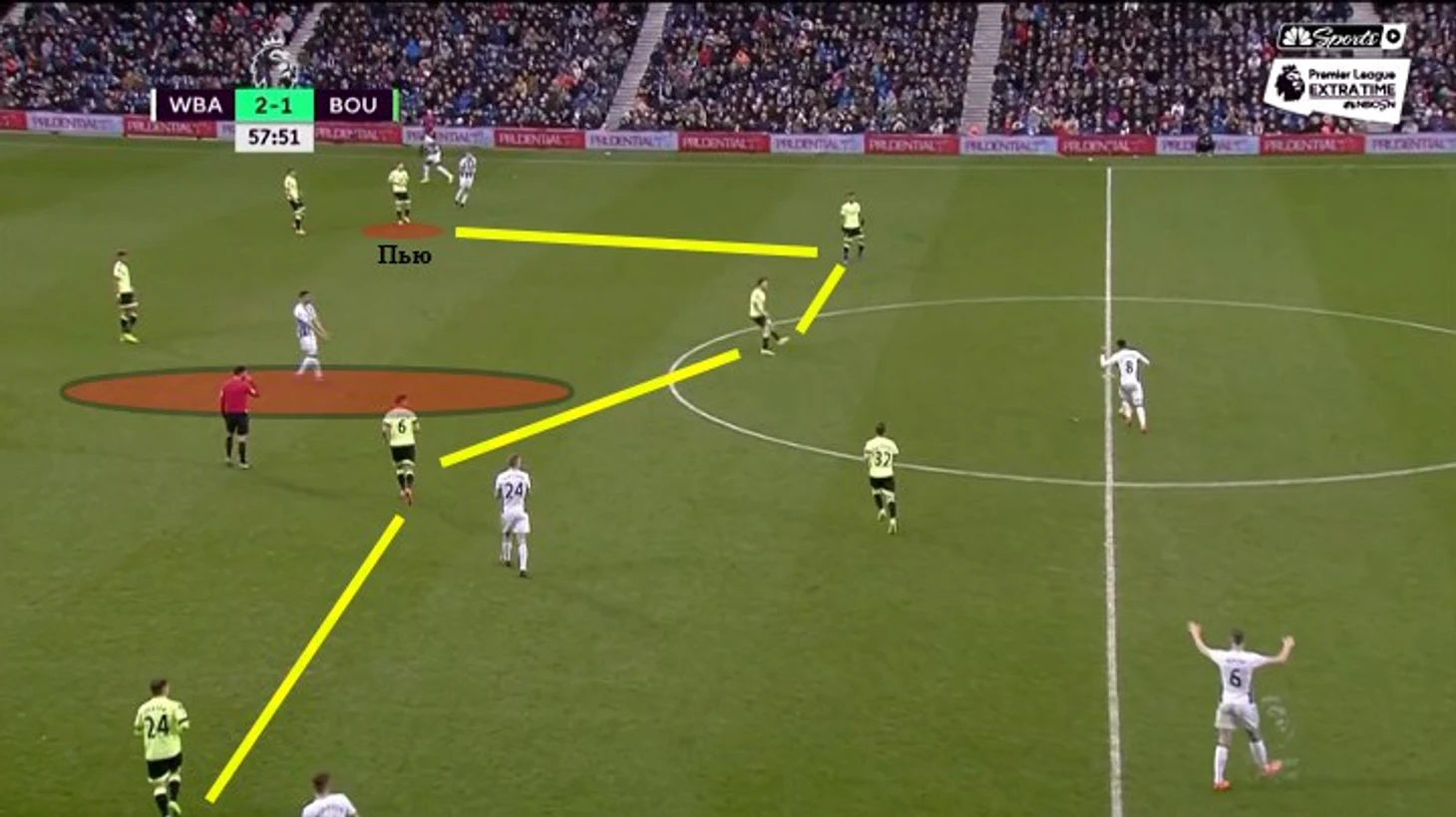 Система опеки «ВБА» против комбинаций «Борнмута». «Вест Бром» – в числе команд, использующих ортодоксальную систему опеки. Конечно, они не играют персонально по всему полю, но и их подход, это нечто более жесткое, чем man-oriented в зоне. Персональные ориентировки в зоне предполагают ближайшего к обороняющемуся в его зоне в качестве главного ориентира, однако все равно важно поддерживать более-менее оптимальное расстояние до партнеров, плюс, если соперник выходит из зоны без мяча, он не преследуется. У Пулиса же подход ближе к man-to-man – ориентация на конкретных игроков, плюс фулбеки (если так можно назвать, например, Доусона), вингеры и центральные полузащитники могут уходить за своими прямыми соперниками за пределы своей зоны. Склонный к построению игры через низ «Борнмут» предложил две комбинации под такой вариант: