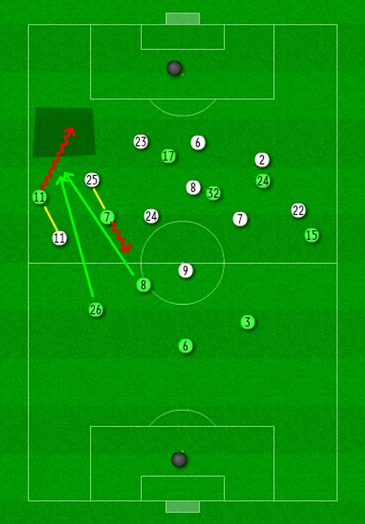 Пью пользовался излишней ориентацией Доусона и выдергивал его с позиции правого защитника, создавая пространство для подключения фулбека Дэниэлса (весьма опасного в них), который за счет более раннего рывка получал перевес над Брантом. Здесь стоит отметить так же своевременные сквозные передачи Артера и Мингза (под градом достаточно заслуженной критики даже за игру на не самой привычной позиции – плюс на контрасте с блестящим Аке – не сломался и прибавил в игре на мяче, правда пустился пару раз в очень рискованные подкаты – сам факт таковых уже говорит о не лучшей защите, – но выходил минимум не проигравшим).