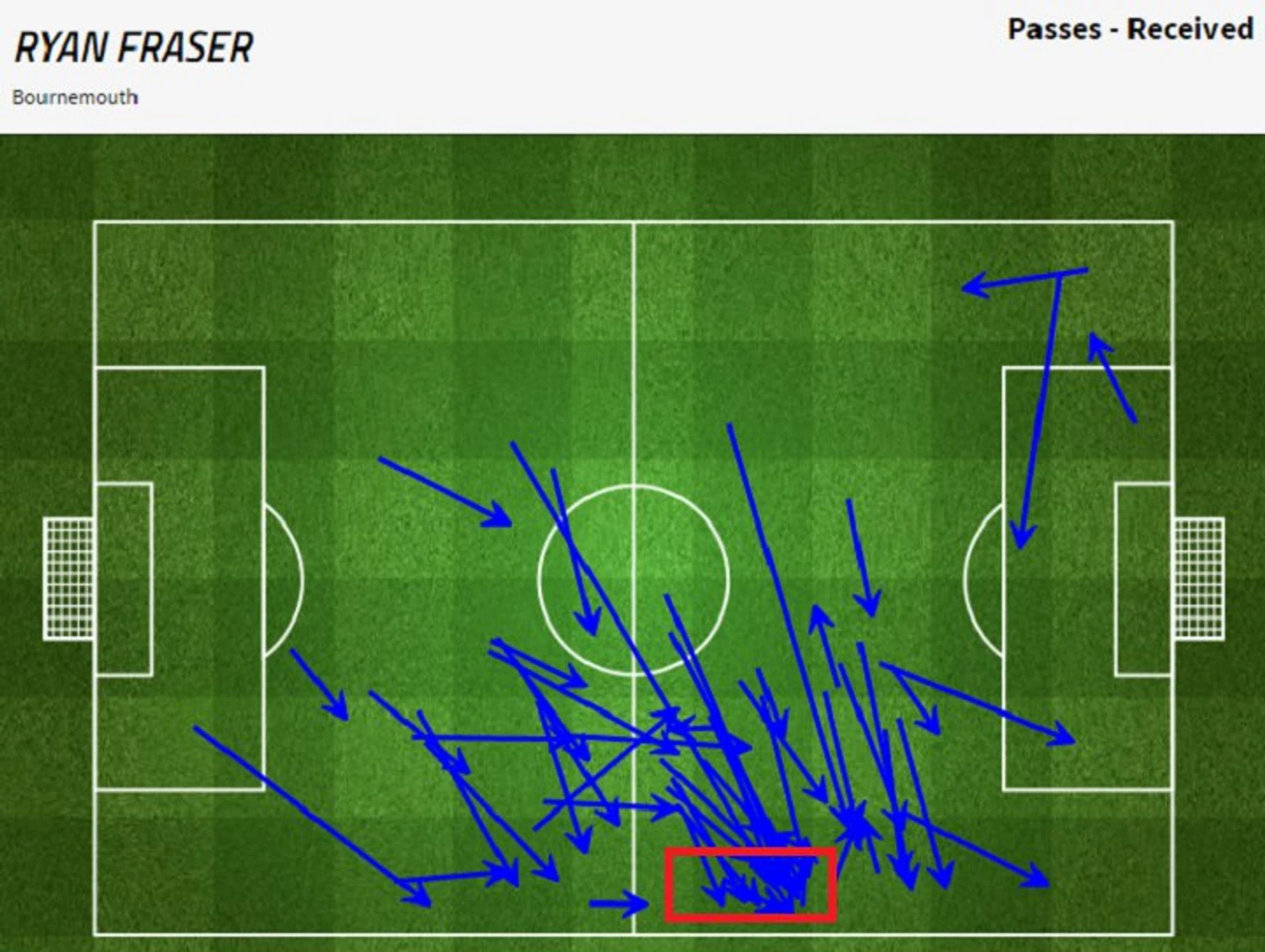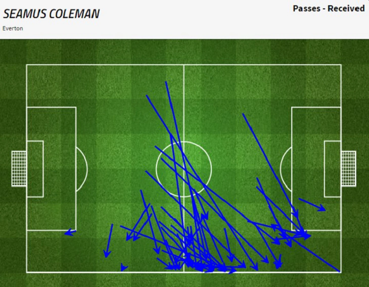 Карта полученных передач Коулмэна, минимальное число на своей половине поля.