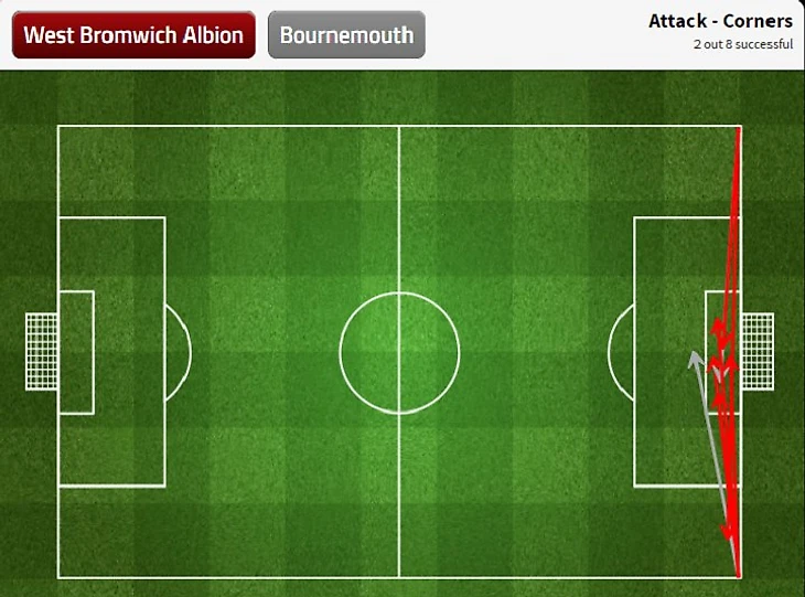 Угловые «Вест Брома». Обратите внимание на две вещи –кучность (все в центр вратарской) и то, что хоть и ни одна подача не была точна с первого касания, большинство их них (по вышеперечисленным причинам) приводили к опасности.
