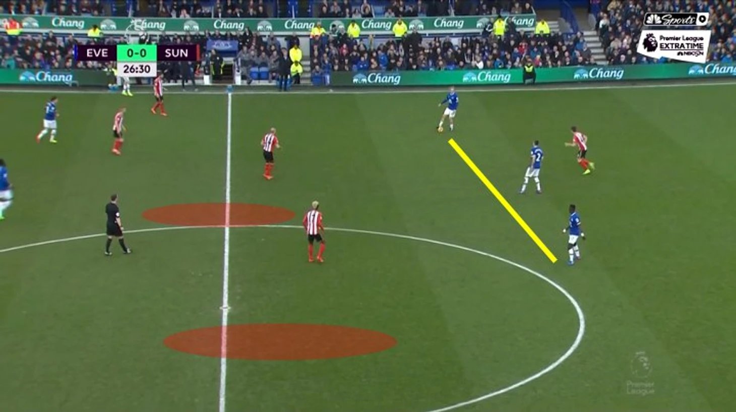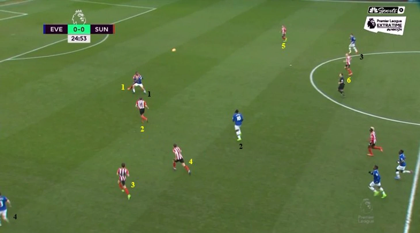 Второй вариант – Смит (склонный к смещениям вглубь даже с позиции фулбека) уводит Шадли, оставляя Фрейзера перед Ньомом потенциально 1 в 1, мяч доставляется направо, Фрейзер пытается решить. Интерес ситуации в том, что Ньом – правша на левом фланге защиты. Это достаточно неплохой ход против инвертированных вингеров, поскольку правой удобнее отнимать, когда человек смещается с фланга в центр под свою левую. Однако, Фрейзер – правша, обыгрывающий чаще во фланг, и это наверняка учитывалось Хау.