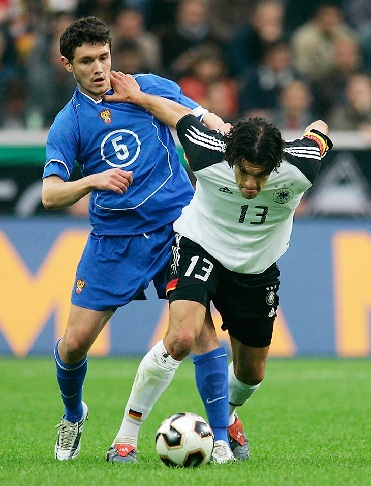 2005. ГЕРМАНИЯ - РОССИЯ (2:2). Первый матч нашей сборной под рук. Ю.П.СЁМИНА (недавнего героя побед Локомотива над Интером!) В борьбе за мяч тогдашний Символ немецкой сборной М.БАЛЛАК и будущая Звезда Российского Футбола Ю.ЖИРКОВ (в синем), обладатель Кубка УЕФА-2005 и будущий герой ЧЕ-2008!