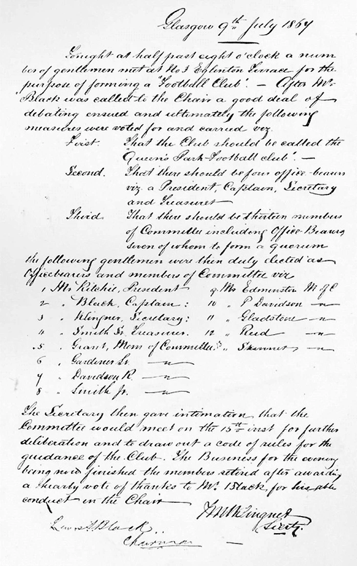 9-го числа, в полдевятого вечера в доме по адресу Эглинтон-террас, 3, Виктория-роуд собралось около 20 молодых людей. Хайлендцев было большинство, пришел кто-то из местных и, возможно, кто-то из ИМКА. С основными должностями разобрались быстро, а вот над названием пришлось посидеть. Некоторые, памятуя о северных корнях, хотели, например: «The Northern», «Morayshire», «The Celts». Джеймс Грант предложил «Queen’s Park», объяснив, что если у клуба есть будущее, то наречь его стоит в честь того места, с которым он теснее всего связан. Этот вариант и приняли, с перевесом в один голос. Через месяц секретарь Уильям Клингнер раздобыл правила игры (английской ФА), которые ему прислал Джон Лиллиуайт, знаменитый ноттингемский крикетист, занимавшийся в Лондоне торговлей спортивными товарами. Правила были прошлогодние, так что малость неактуальны, но выбора у «Куинз Парка» не было – рассмотрели что есть, напечатали и распространили. Оставалось только их освоить и начать играть.