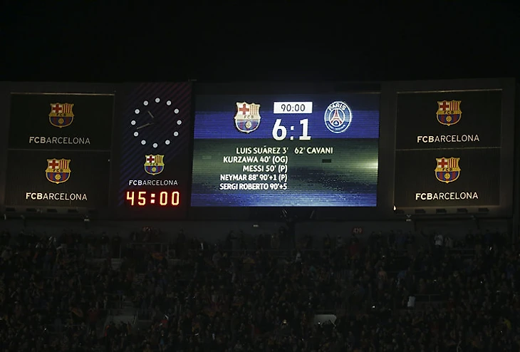 2. Пропустив в середине второго тайма, «Барселона» была обязана забивать сразу три. Голы не шли до 88-й минуты – и за последующие 7 минут «Барса» запулила как раз три гола. Последний – за 21 секунду до конца добавленного времени. На часах было 94:39...