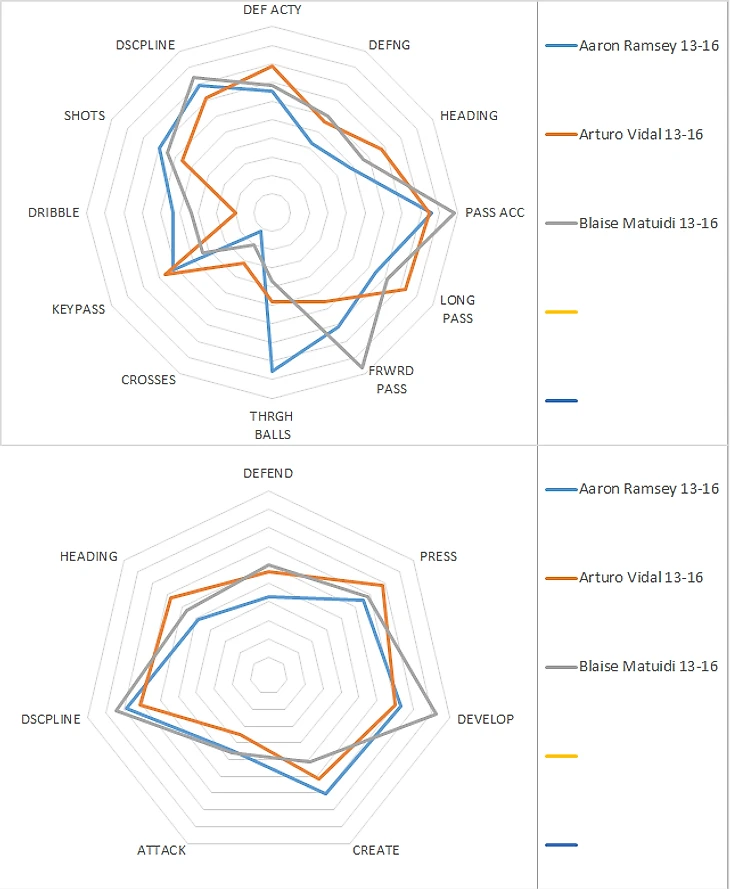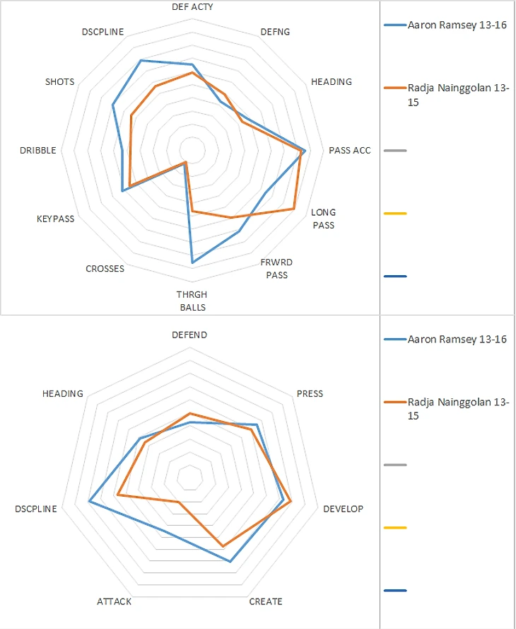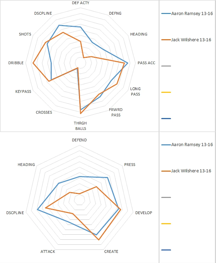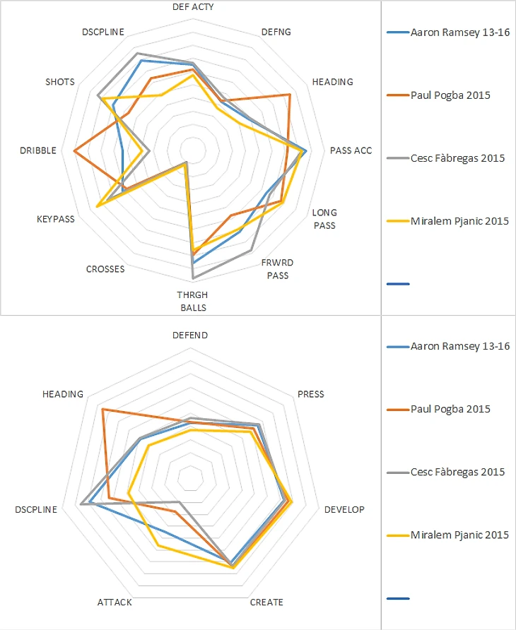 Голова – оборона – прессинг – выход из обороны отличаются на полбалла, креатив и атака у Рэмзи выше.