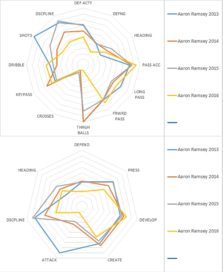 В этом сезоне у Рэмзи упали оборонительные характеристики (вероятно, за счёт того, что в Арсенале появился ещё один, помимо Коклена, оборонительный полузащитник) и упали креативно-атакующие характеристики (трудно сказать, за счёт чего), выход из обороны остался на уровне.