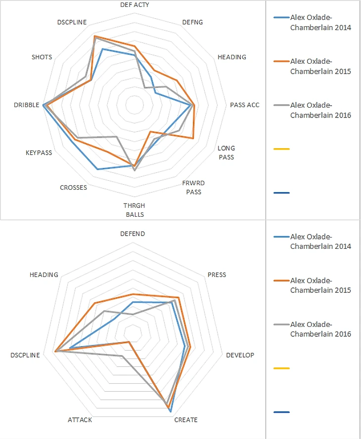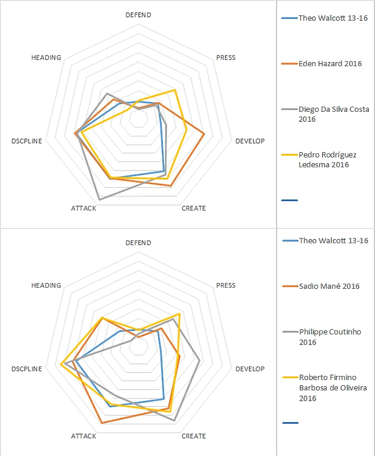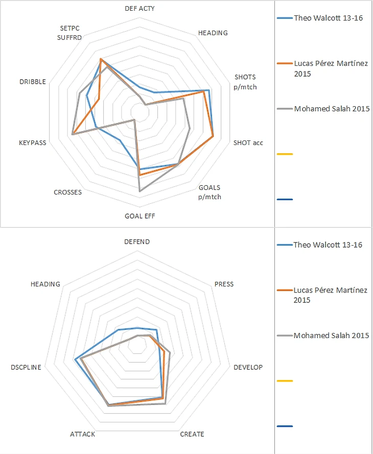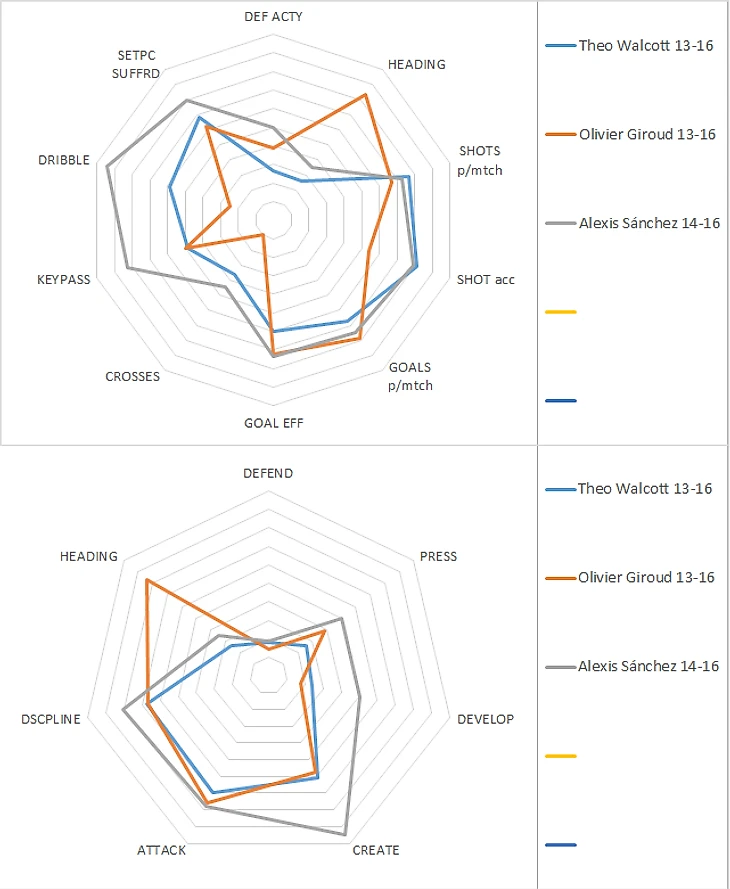 Алексиса на одну диаграмму с Уолкоттом и ставить неприлично, игроки с разных планет. Интереснее сравнение с Жиру: почти идентичные параметры по атаке и креативу при том, что у Жиру игра головой больше восьми, а у Уолкотта меньше трёх.