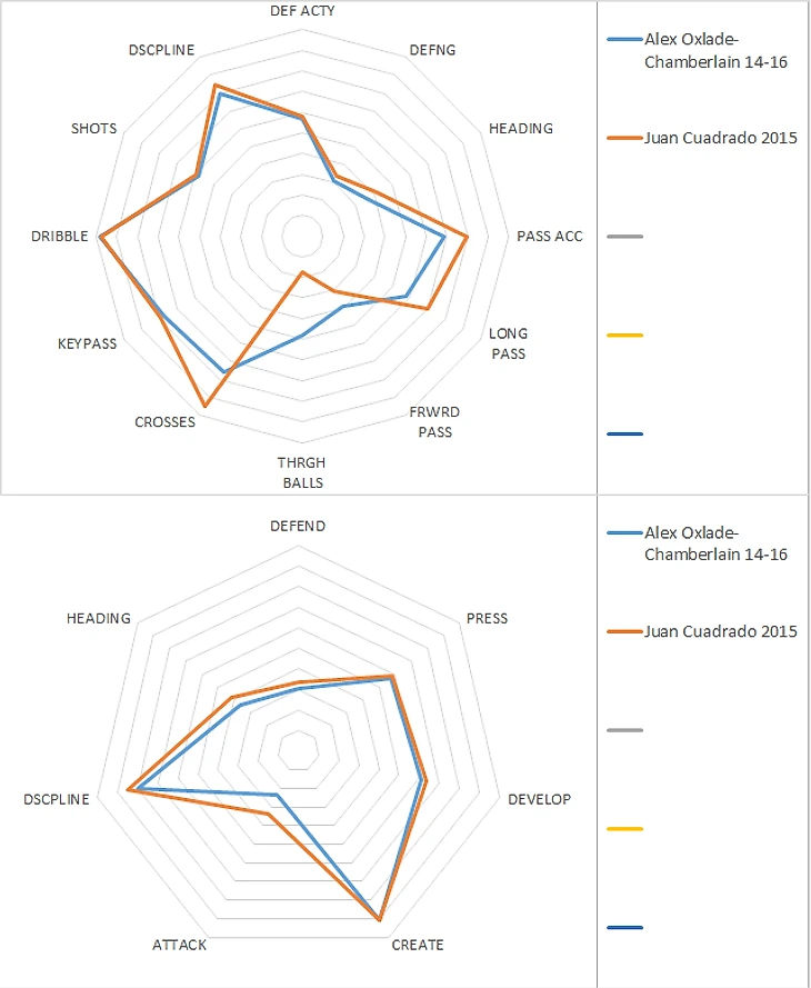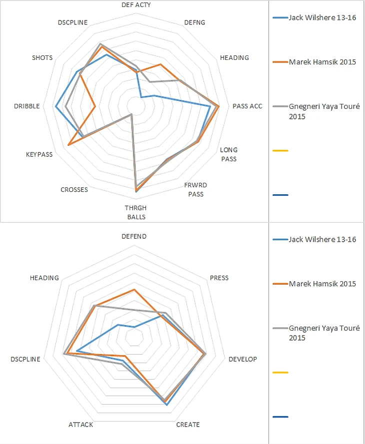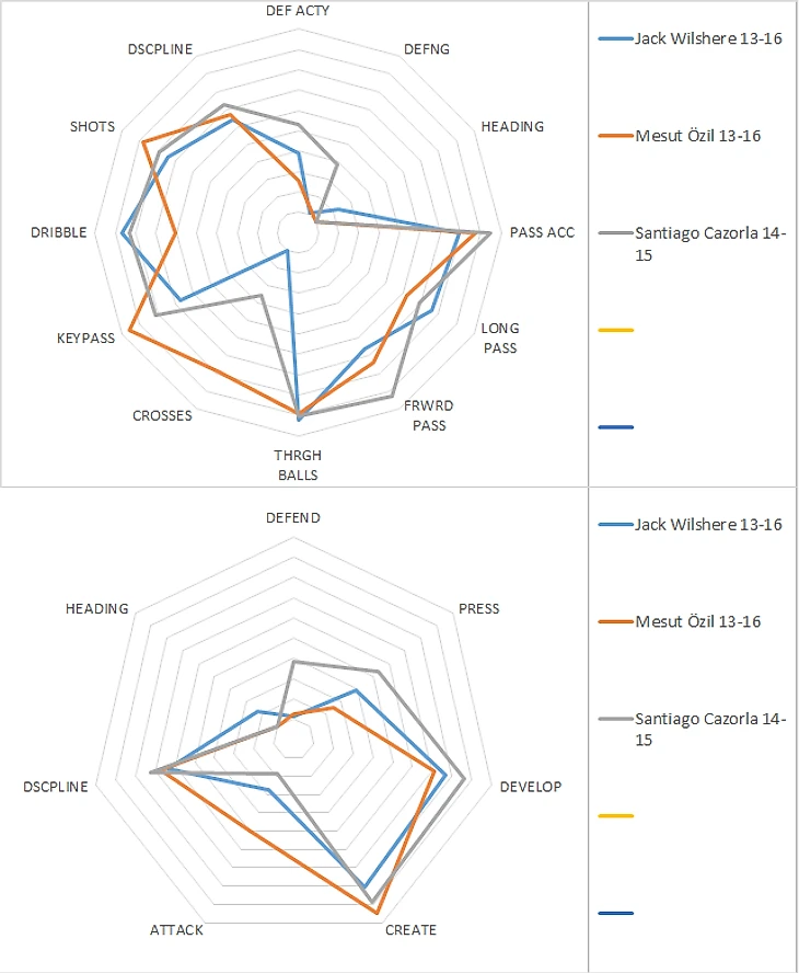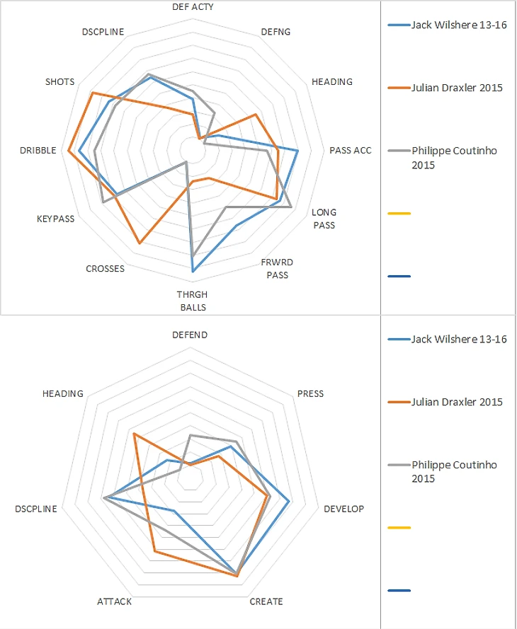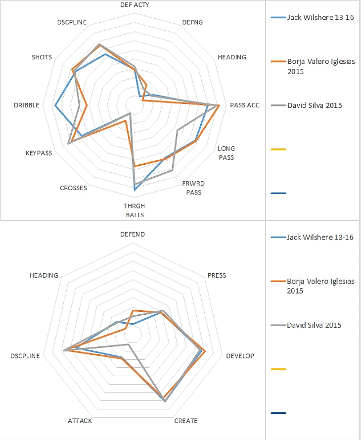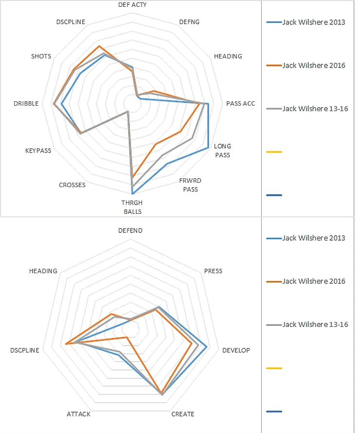Бросается в глаза просадка по качеству паса у Джека: выход из обороны по сравнению с сезоном 13/14 упад с почти девяти до семи. Трудно сказать, связано это с другой командой и другим тренером или со снижением мастерства самого Уилшэра, но вообще диаграммы достаточно сильно похожи и показательны, дальше будем опираться на среднюю.