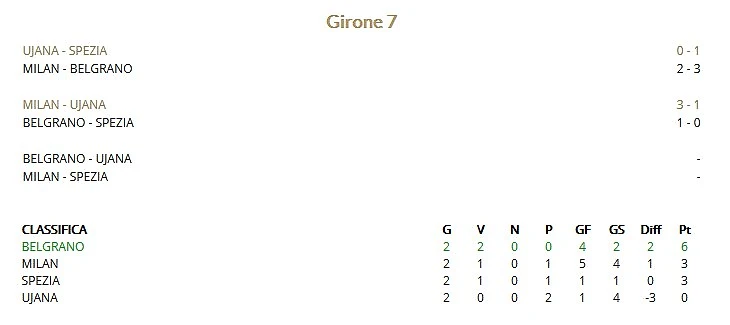 После двух туров миланцы имеют шансы выйти в следующий этап турнира. «Россонери» предстоит разыграть путевку в очном противостоянии со «Специей» в последнем туре группового этапа.