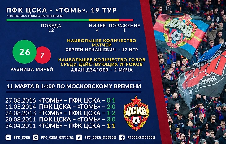 Наибольшее количество встреч в противостоянии #ЦСКАТомь провёл Сергей Игнашевич. Более того, сегодняшний матч может стать для Игнашевича 456-м в чемпионатах России. Если он выйдет на поле, то догонит по этому показателю рекордсмена, Сергея Семака!