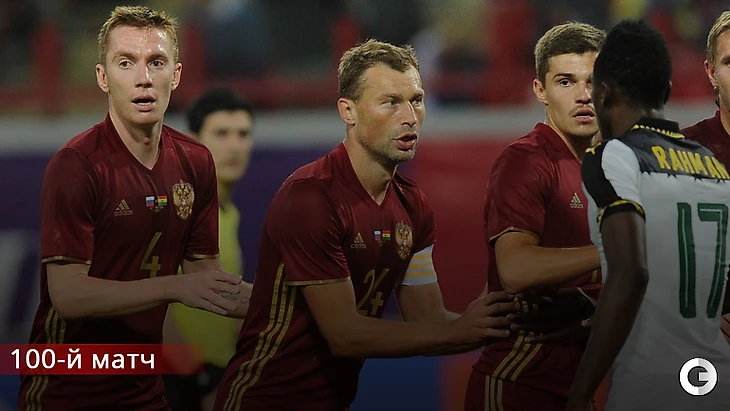 6 сентября 2016 года. Москва. Товарищеский матч. Россия - Гана - 1:0. Василий БЕРЕЗУЦКИЙ (в центре) - 100-й матч
