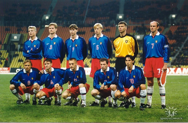 1998 г. Спартаковский Тотально-Открытый Футбол После Подвигов Против Реала и Интера ... Верен Себе и Против Сб. Франции Джоркаеффа и Зидана!.. Сидят: КАРПИН-АЛЕНИЧЕВ-Тихонов-Хлестов-МОСТОВОЙ. Стоят:Бесчастных-Варламов-ТИТОВ-Яновский-Овчинников-Онопко (Москва,ЧЕ. Отб.матч, Россия-Франция, 98 г.)