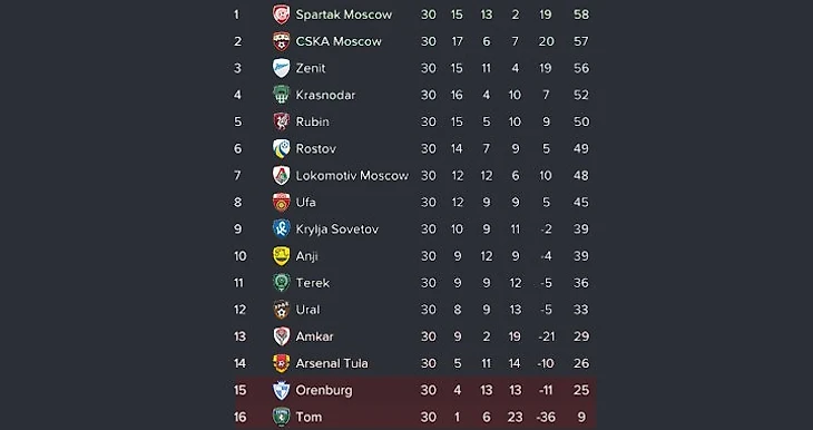 Вывод: «Спартак», имея внушительный гандикап, растерял своё преимущество и чуть не упустил титул. В итоге «ЦСКА» отстал от новоявленного чемпиона лишь на 1 (!) очко. Третьим стал «Зенит», отставший от армейцев тоже на 1 очко. Последнее еврокубковое место забрал «Краснодар».