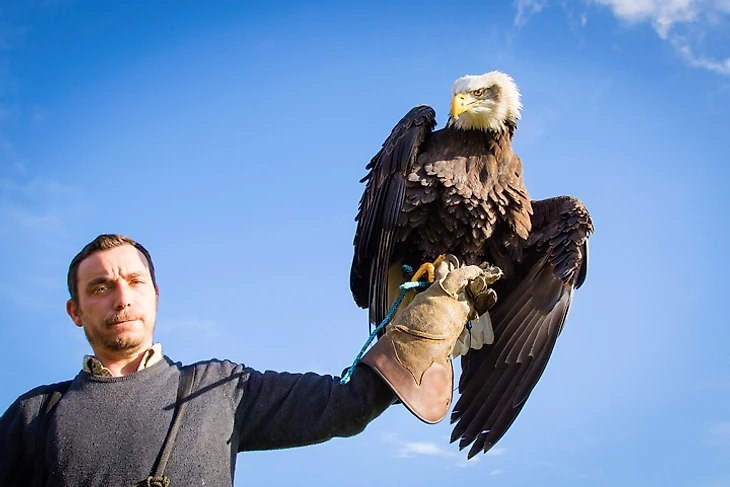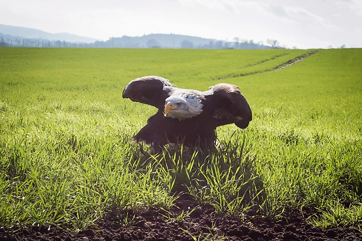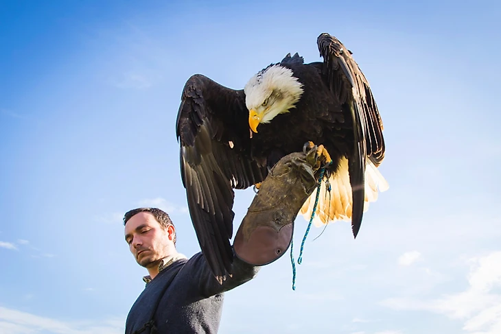 Главная звезда питомника – белоглавый орел Кайла, родившаяся в Канаде. «Еще птенцами ее с сестрой похитили из дикой природы браконьеры, поэтому в детстве она никогда не соприкасалась с реальными птицами, – говорит дрессировщик, пока мы выходим с территории центра на открытое пространство. – Кайла была выращена людьми, поэтому даже не подозревает, что она орел и считает себя человеком».