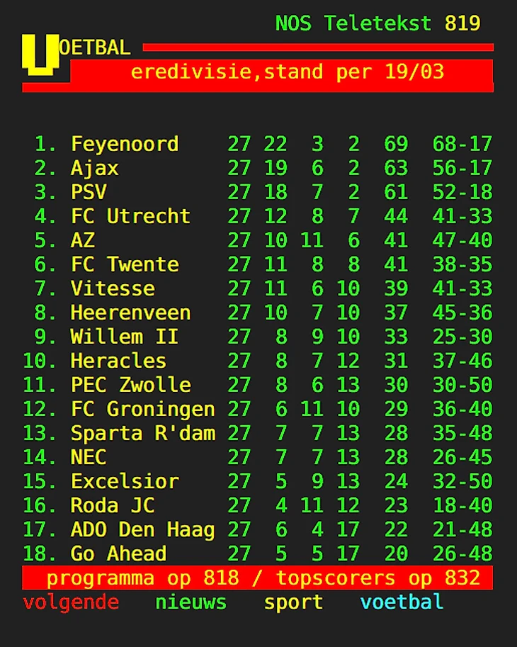 - Ни одна из команд в истории Эредивизи не упускала чемпионство, лидируя к 27 туру с отрывом в 6 и более очков. На заметку «Фейеноорду».