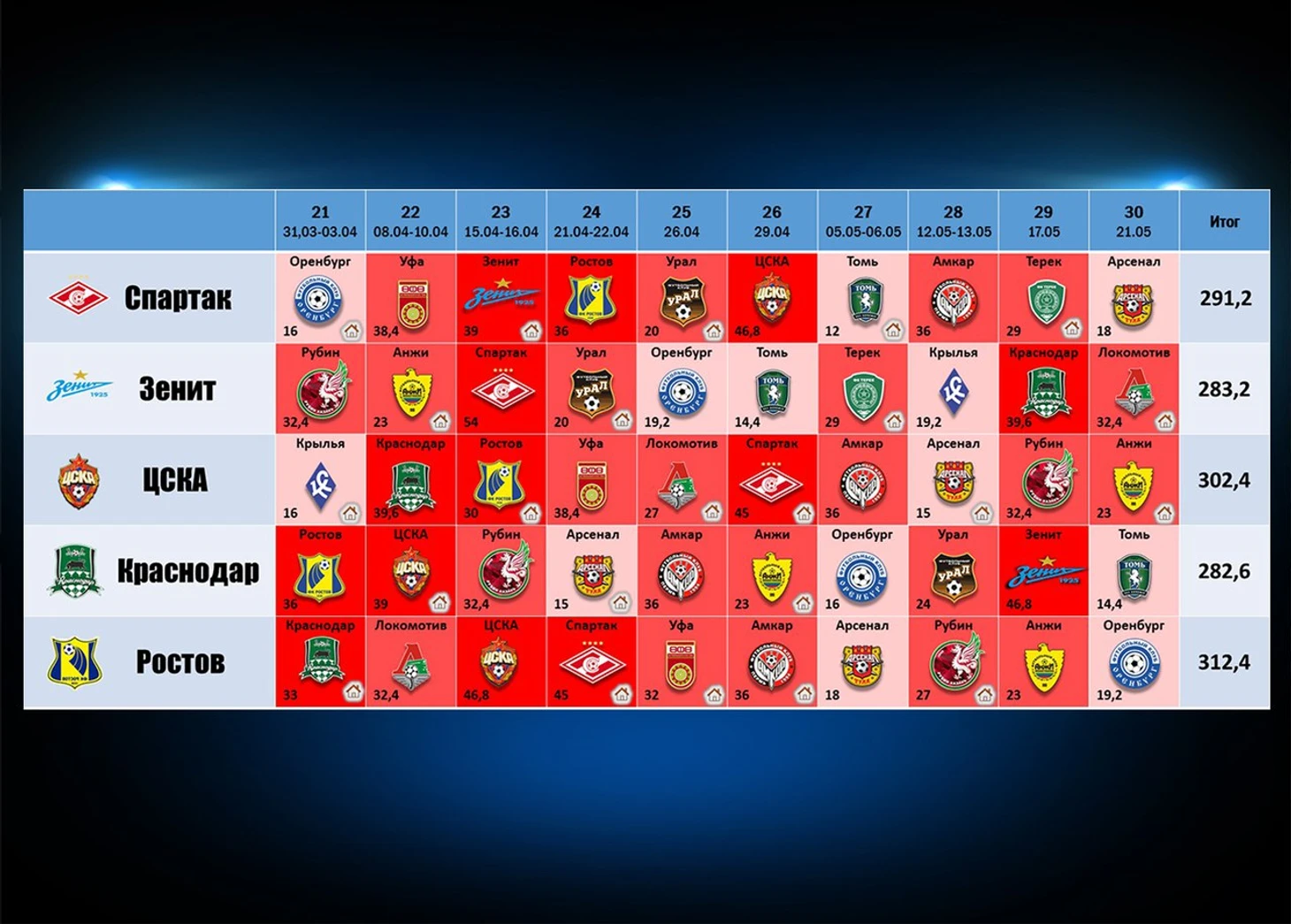 Графа "Итог" это общая сложность оставшихся игр, состоящая из слагаемых, посчитанных по следующему принципу: в случае домашнего матча прибавляется количество набранных очков соперником по результатам 20 туров, если же команда играет в гостях, то эти очки умножаются на условный коэффициент 1.2. Пример: Спартак в 22 туре едет в Уфу. Клуб из Башкортостана набрал за 20 игр - 32 очка, а так как для москвичей это гостевая встреча, то сложность ее будет рассчитана следующим образом 32*1,2=38,4