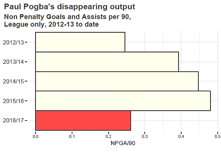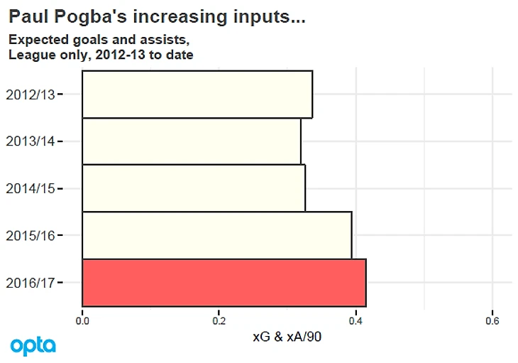 Уровень ожидаемых ассистов Погба в этом сезоне вдвое меньше того, что он демонстрировал в прошлогоднем Ювентусе. Тогда он вносил наибольший вклад в показатель xA лишь немного уступая Пауло Дибале. Такое чувство, что Юнайтед подписывали целого Погба, а получили лишь его половину.