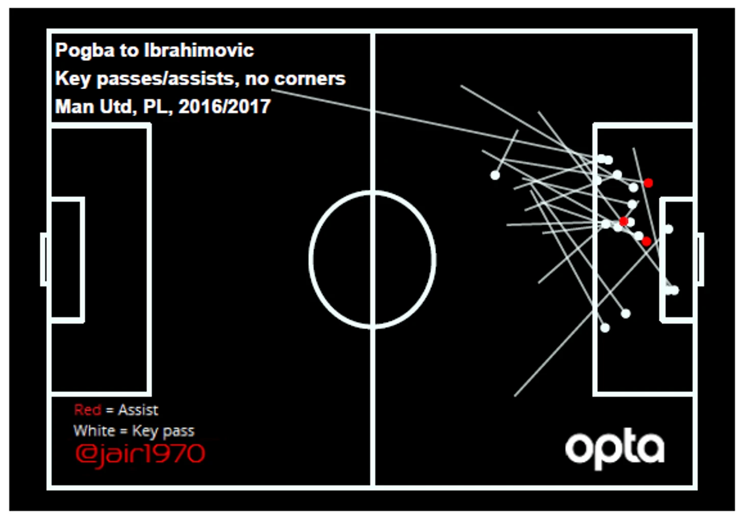 Также замечательно проявляет себя пара Погба – Ибрагимович, совершающая львиную долю всех полезных атакующих действий МЮ. Наиболее популярное направление key passes для Юнайтед в этом году это Погба – Ибрагимович ( 19 key passes), на втором месте Ибрагимович – Погба (14 key passes).