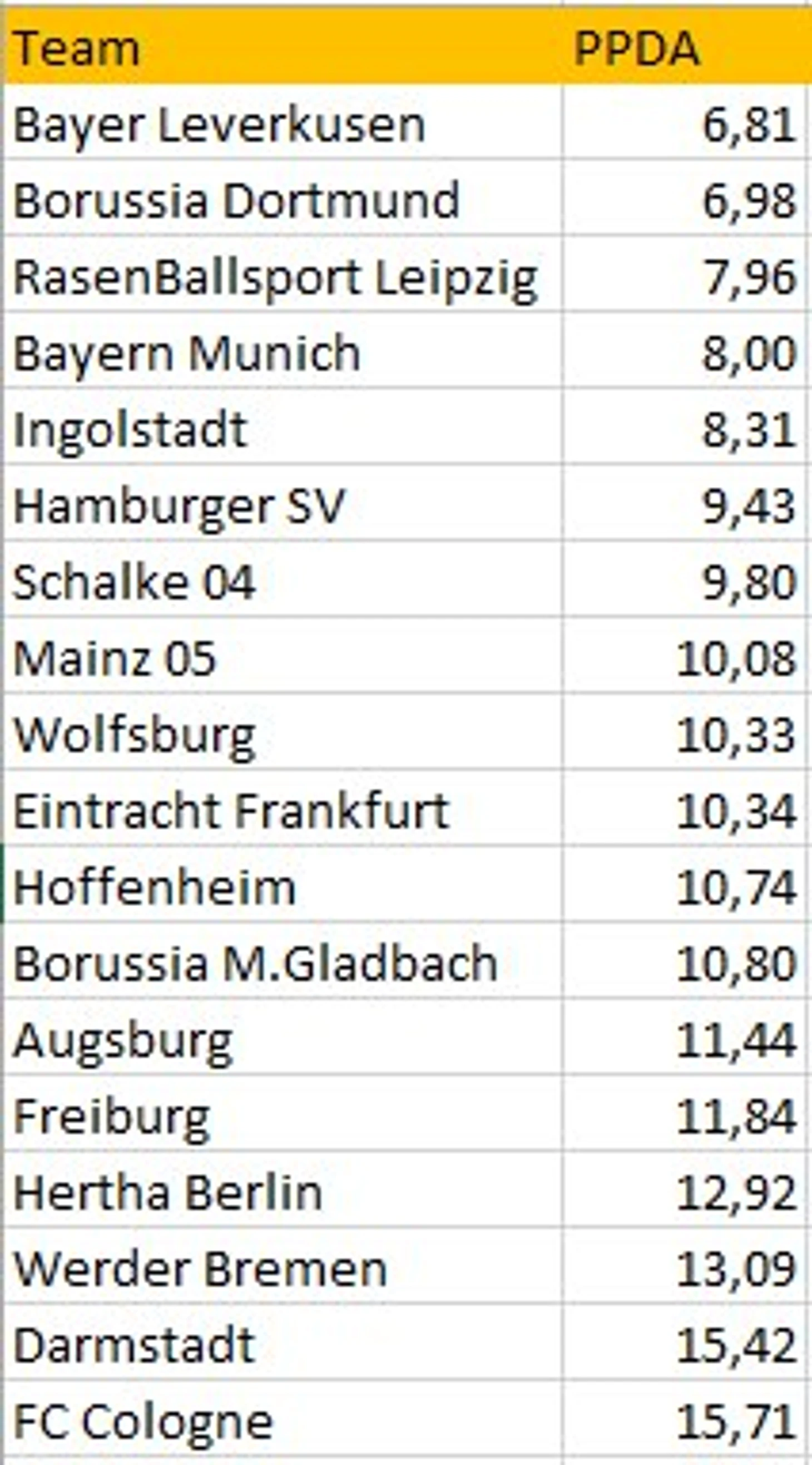 PPDA - passes (allowed) per defensive action - статистика, которая оценивает уровень прессинга команды.PPDA для Бундеслиги.